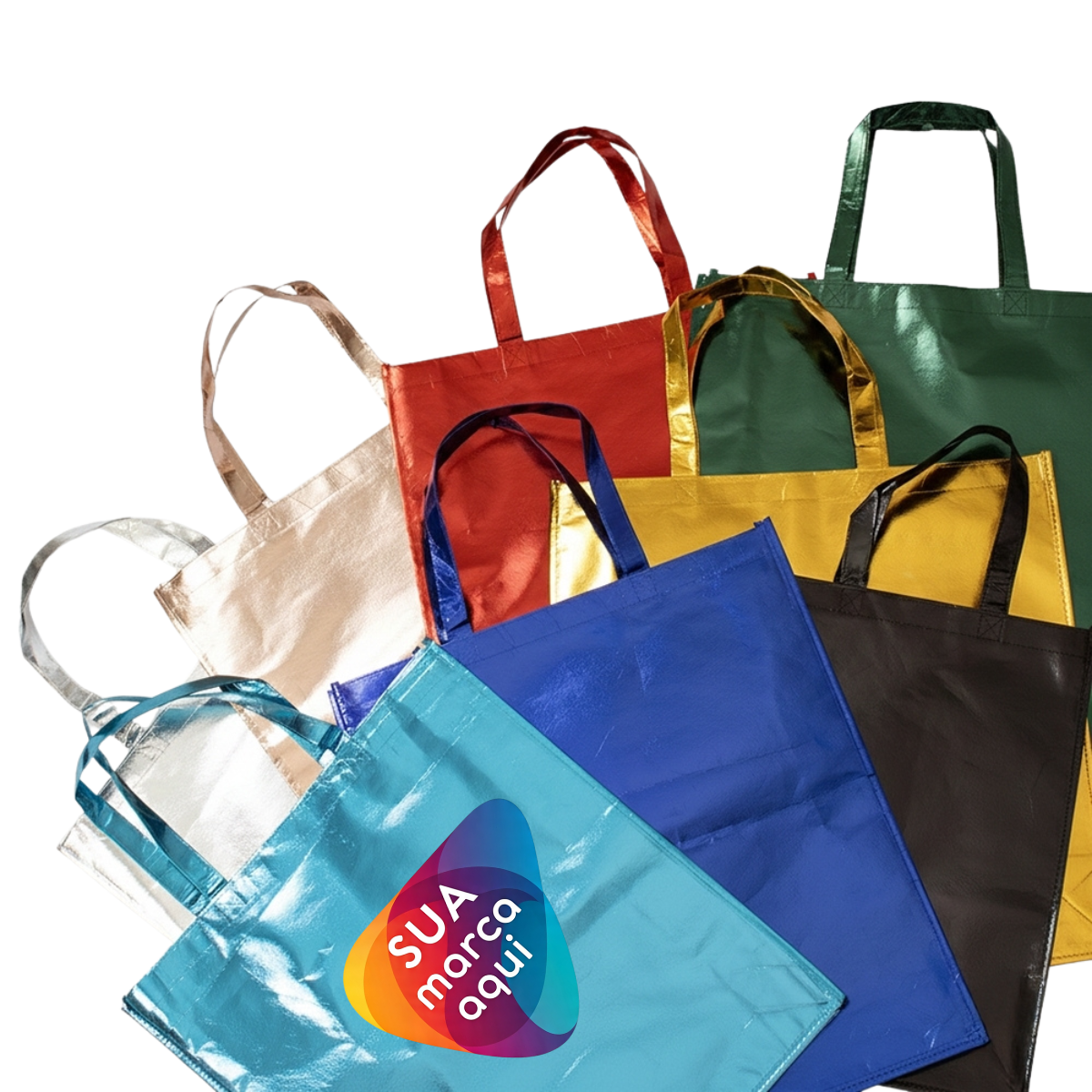 Sacola confeccionada em TNT com revestimento externo laminado e duas alças costuradas.