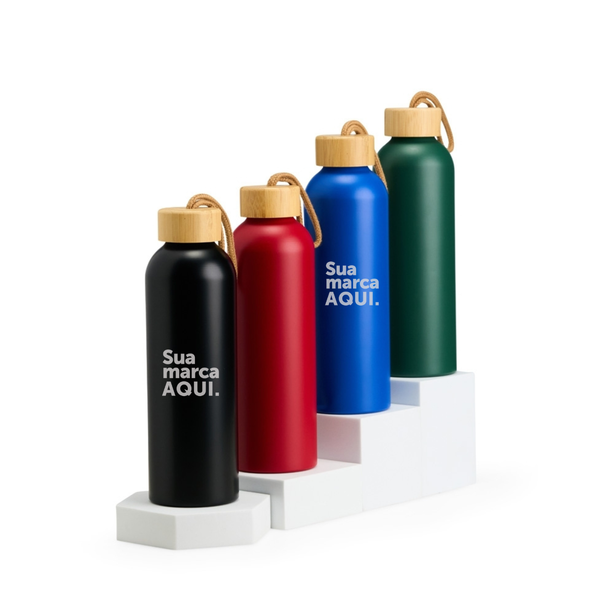 Garrafa de alumínio com capacidade de até 800ml. Feita com material de alta resistência, é uma opção prática para o dia a dia. Além disso, possui tampa rosqueável de bambu com alça de algodão para facilitar o transporte.