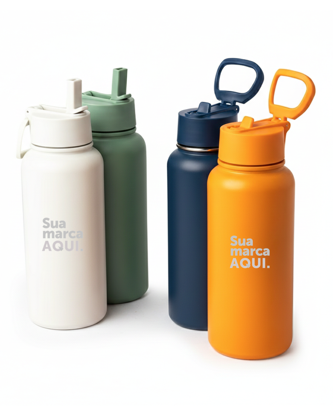 Garrafa térmica de parede dupla em inox, capacidade de 900ml. Tampa rosqueável com alça de transporte, bico flip e canudo interno.