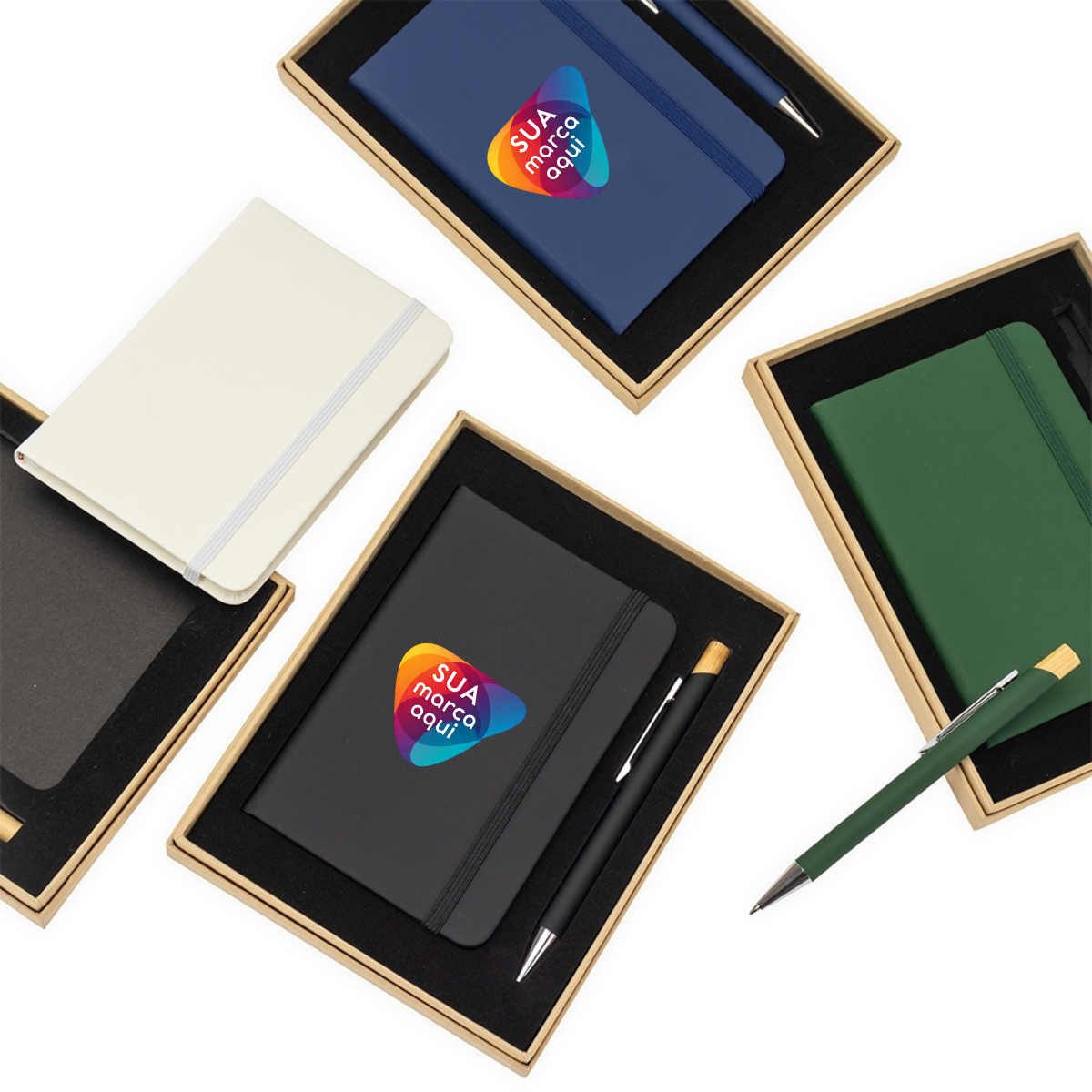 Kit executivo composto por uma caderneta e uma caneta. A caderneta possui capa dura em couro sintético, marca-páginas em fita de cetim e elástico para fechamento, além de aproximadamente 80 folhas com pauta. Por sua vez, a caneta metálica conta com detalhe em bambu, acionamento por clique e carga esferográfica azul de 1,0mm. Acompanha uma caixa de papelão com berço interno em espuma.
