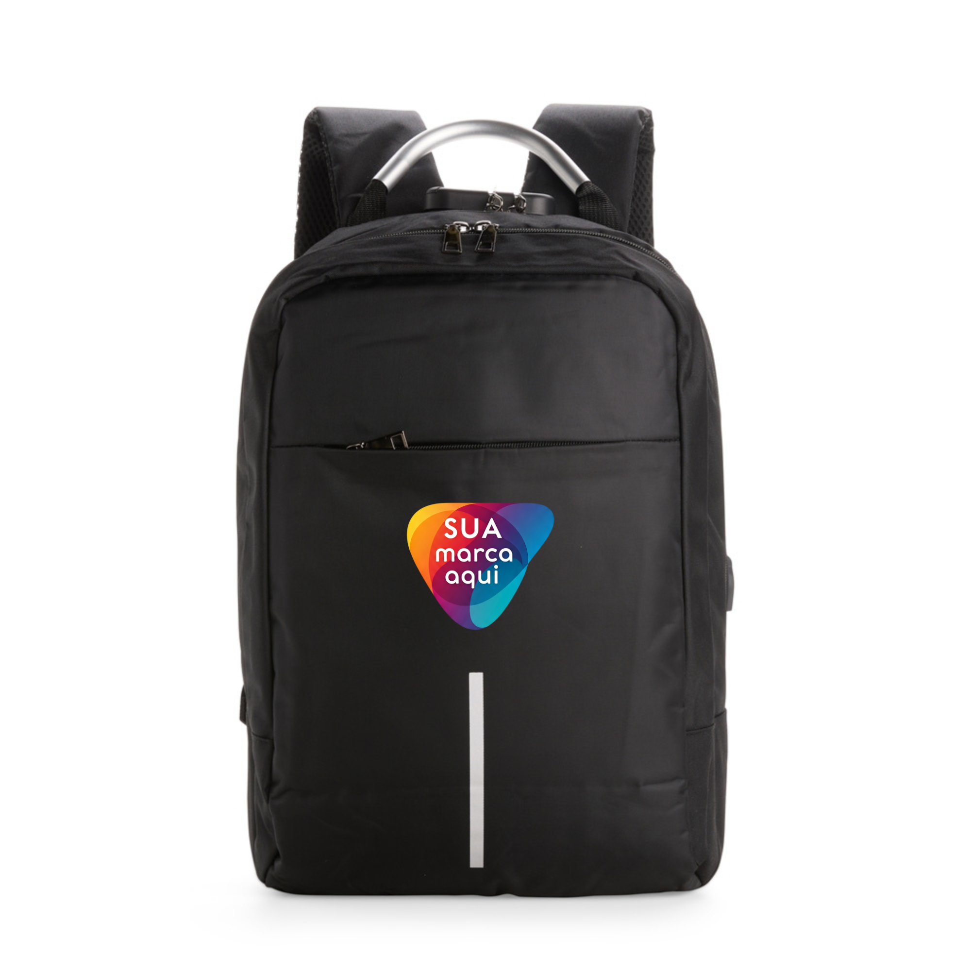 Mochila antifurto em poliéster impermeável, com capacidade de 16 litros e fechamento em zíper. Possui cadeado de segredo, entrada externa para cabo USB, passagem para fones de ouvido, três compartimentos de diferentes tamanhos, incluindo bolso frontal com divisória para notebook de até 15,6 polegadas e alça superior reforçada. Conta ainda com engate para malas, alças de costas e painel traseiro acolchoados.