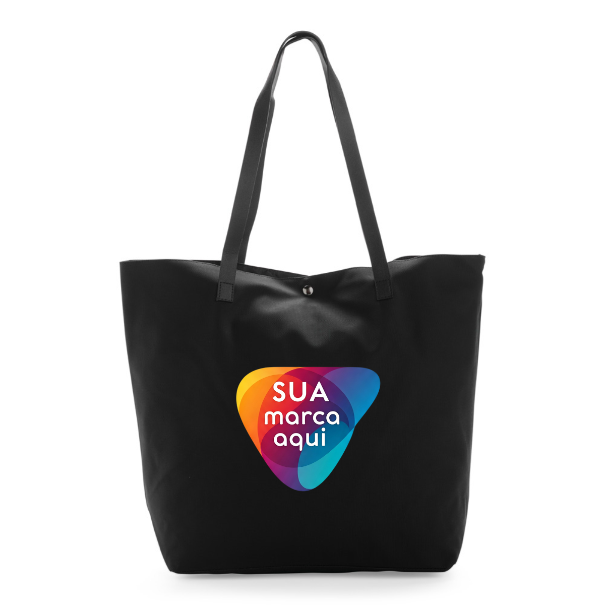 Sacola confeccionada em couro sintético à base de PVC com par de alças de costura externa e botões magnéticos metálicos para fechamento. Possui revestimento interno em poliéster e bolso compacto com fechamento em zíper.